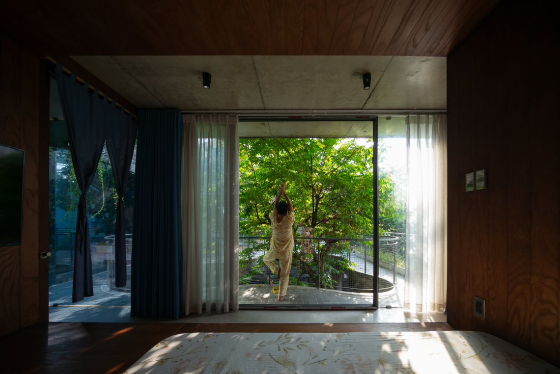 Phòng ngủ Master tầng 2 và phòng ngủ tầng 3 đều có bố cục như hộp gỗ nhưng vẫn thiết kế mở với khoảng hành lang chuyển tiếp liền mạch.