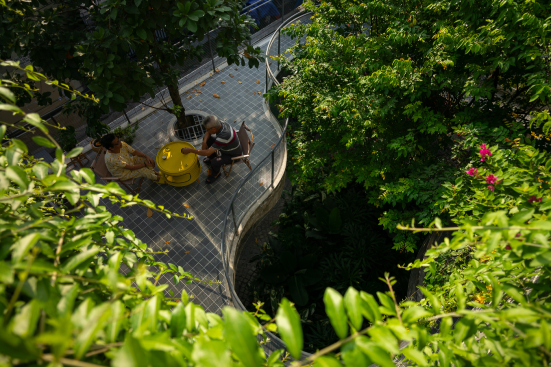 Tầng trệt: Đây là không gian mở dành cho sinh hoạt chung và tương tác. Phòng khách và bếp được kết nối trực tiếp với giếng trời và các mảng xanh nhỏ, khuyến khích sự giao tiếp hàng ngày giữa các thành viên.
