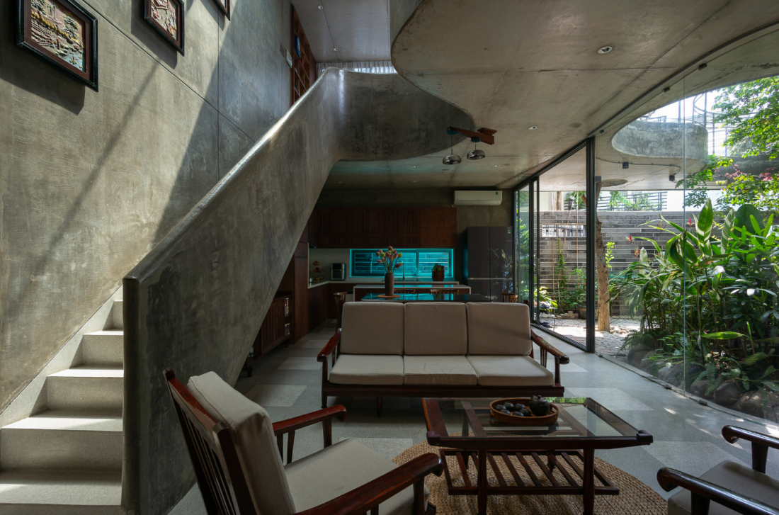 Điểm nhấn kiến trúc lớn nhất của ngôi nhà nằm ở cách xử lý ánh sáng và thông gió như: Tái định nghĩa giếng trời. Giếng trời trung tâm được thiết kế không chỉ để lấy sáng thẳng đứng mà còn được biến thành một bộ lọc ánh sáng tinh tế. Ánh nắng không còn gay gắt mà được làm dịu, phân tán đều, giúp toàn bộ không gian nội thất có ánh sáng đồng đều và dễ chịu.