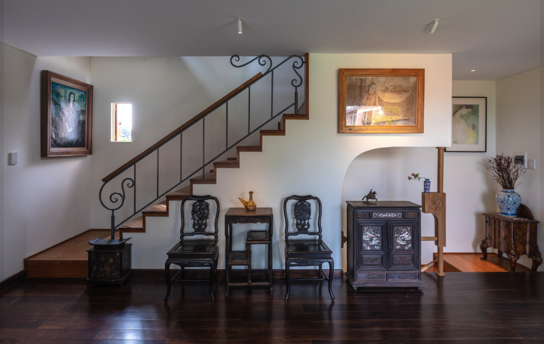 Nằm trên tầng hai, phòng khách ngập tràn ánh sáng từ đồi xanh bên ngoài. Nội thất tối giản nhưng tinh tế, điểm xuyết bởi những bức tranh được sắp đặt khéo léo, như một gallery nghệ thuật thu nhỏ. Thiết kế mở, liền mạch với không gian chung, phòng ăn và nhà bếp mang đến sự tiện nghi mà vẫn ấm cúng.