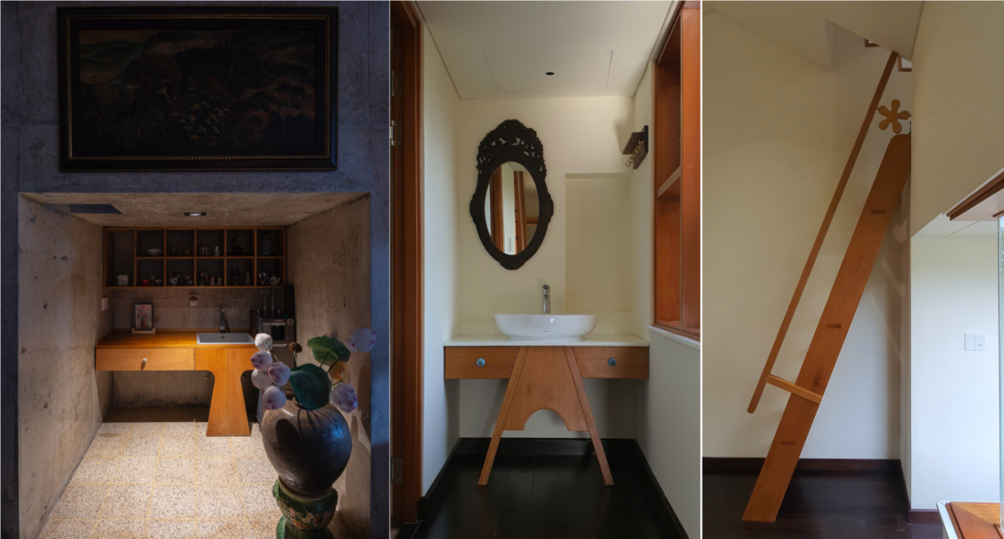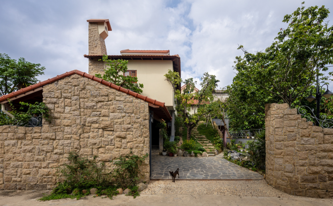 Tất cả các không gian sinh hoạt chung, phòng ăn, bếp và phòng ngủ đều được đặt ở tầng hai, hướng thẳng ra đồi xanh. Thiết kế này tận dụng tối đa ánh sáng tự nhiên và luồng gió trời – điều vô cùng quan trọng trong mùa mưa dài của Huế.