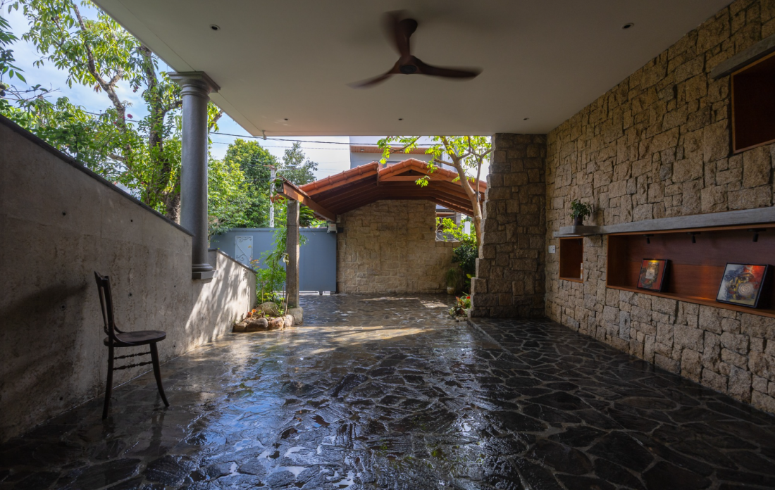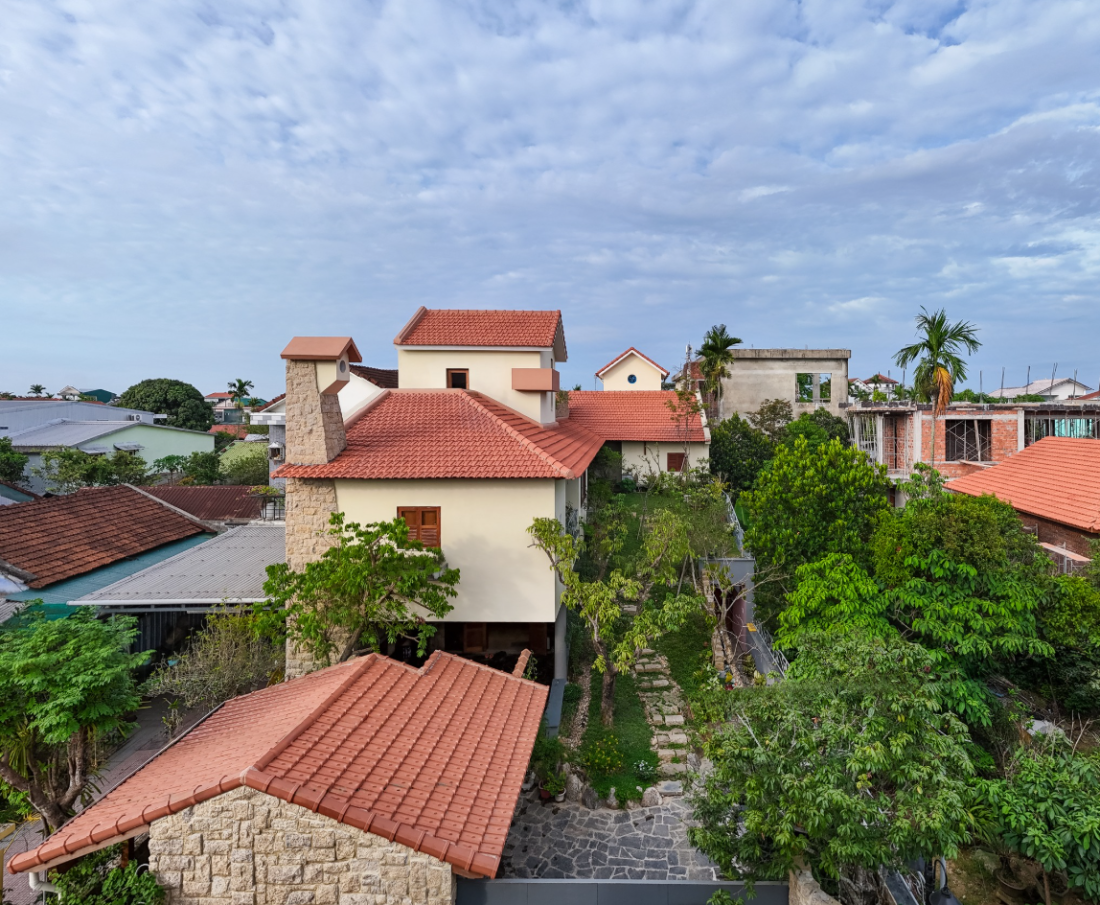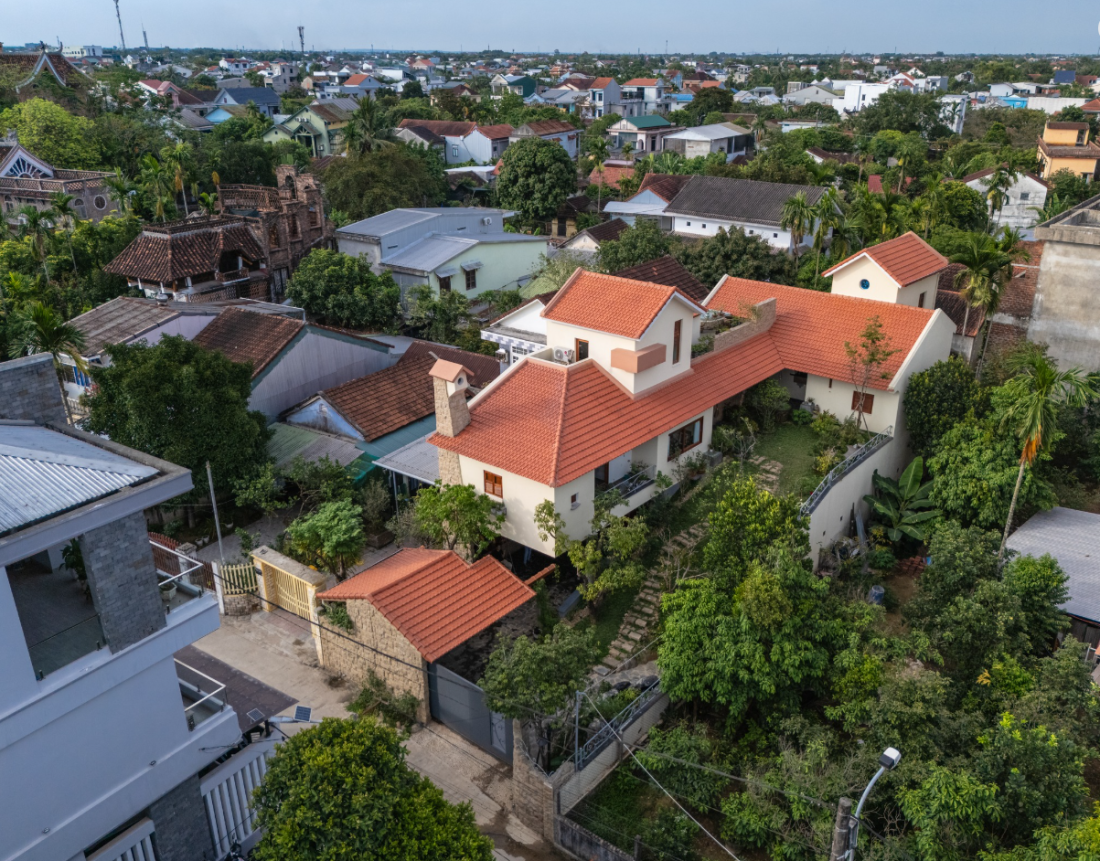 Điểm nhấn độc đáo nhất của ngôi nhà chính là đồi trồng cây xanh bắt đầu từ sân trước và dần nâng lên đến sảnh tầng hai. Mái nhà dốc lợp ngói đỏ không chỉ giúp thoát nước nhanh mà còn gợi nhớ đến hình ảnh những ngôi nhà vườn Huế xưa, tạo nên sự kết nối sâu sắc về văn hóa và thẩm mỹ.