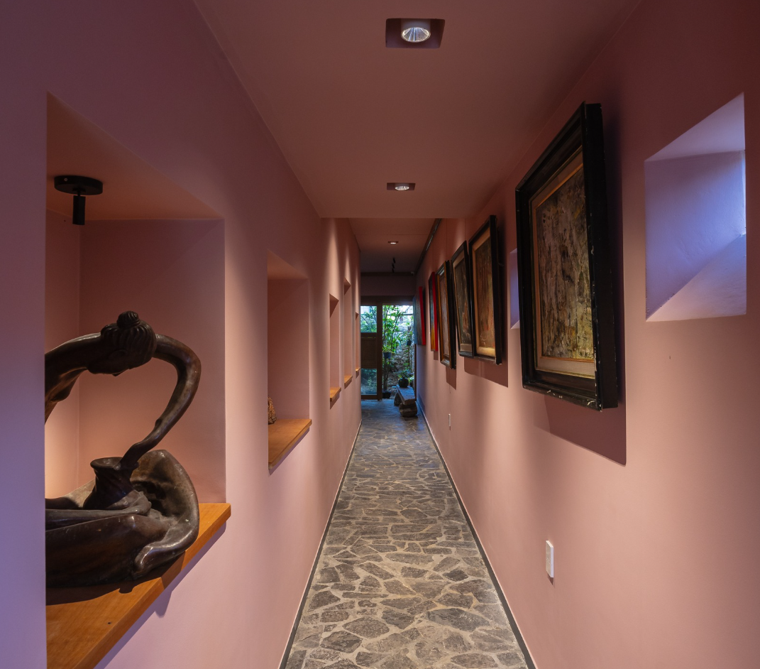 Một ngọn đồi phủ đầy cây cối ngay giữa lòng nhà. Đồi xanh này không chỉ làm mềm mại khối kiến trúc cứng nhắc mà còn khéo léo che đi các khu vực chức năng như kho lưu trữ tranh, quầy bar mini hay tiện ích tầng trệt. Hơn nữa, nó còn đóng vai trò như một máy điều hòa tự nhiên, giúp không gian trưng bày tranh bên trong luôn mát mẻ và thoáng đãng, hòa quyện với thiên nhiên xung quanh.