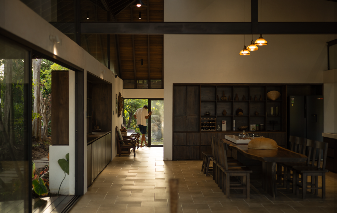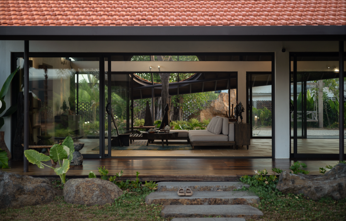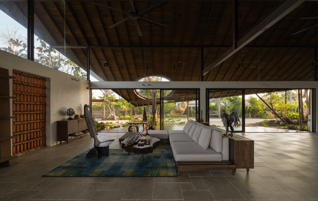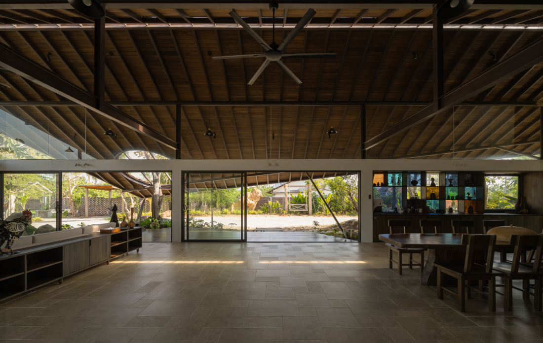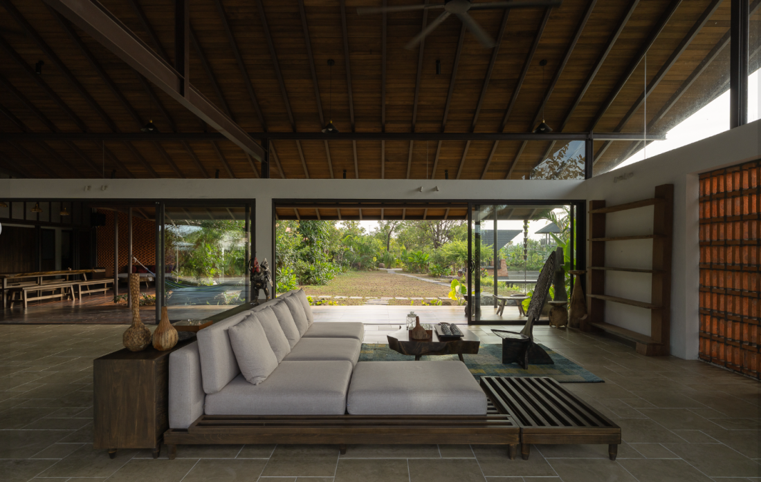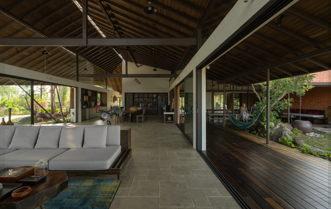 Những ô cửa lớn mở ra sân trong, để ánh sáng tự nhiên tràn ngập và mang theo hương thơm của cây cối. Đây là nơi để cùng nhau xem phim, kể chuyện hay đơn giản là ngồi im lặng, tận hưởng sự hiện diện của nhau.