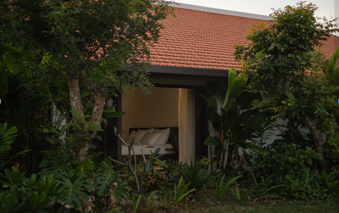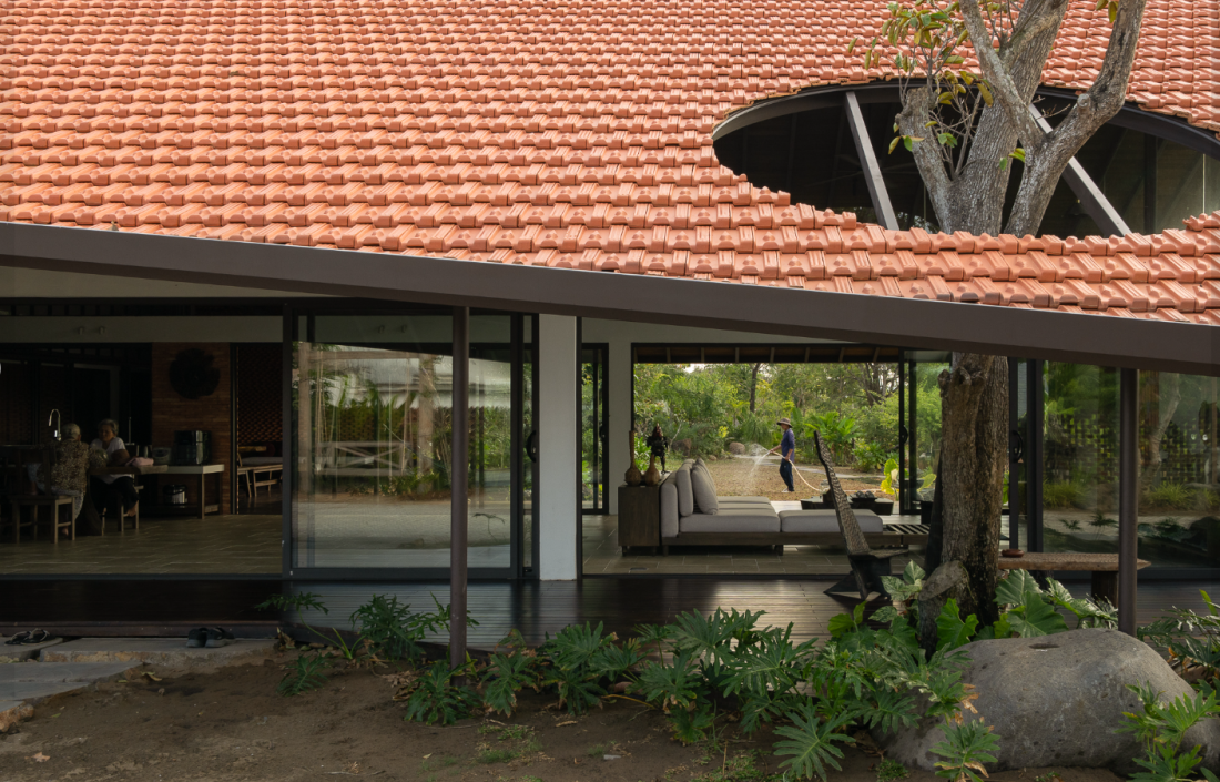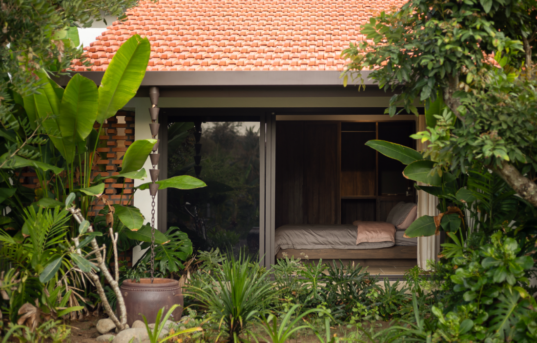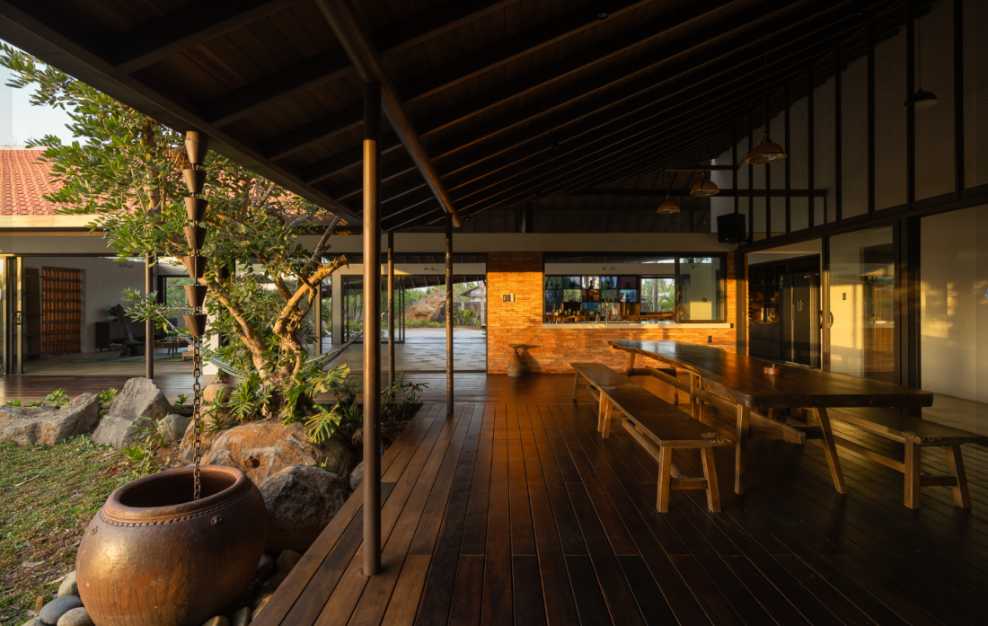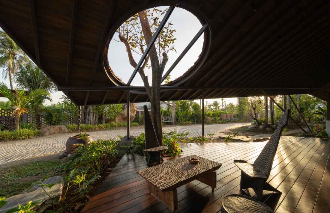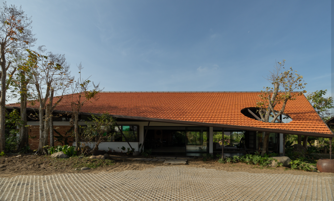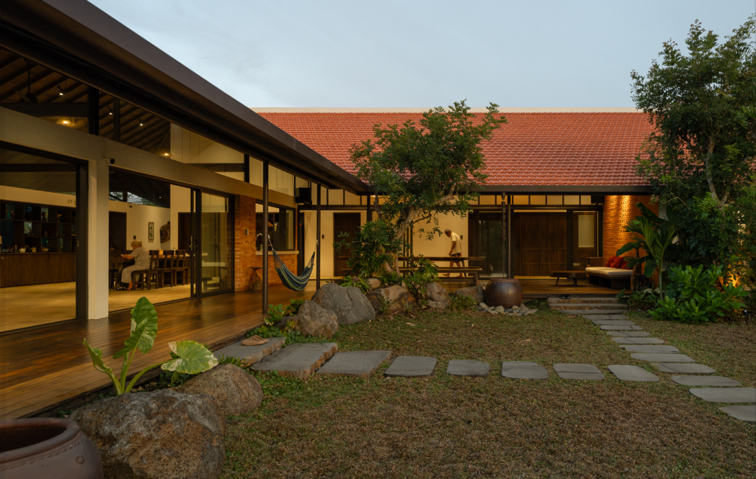 Gỗ tự nhiên, gạch tái chế và ngói đỏ truyền thống được sử dụng khéo léo, không chỉ bền vững mà còn gợi lên sự ấm áp, thân thuộc của những ngôi nhà Việt Nam xưa.