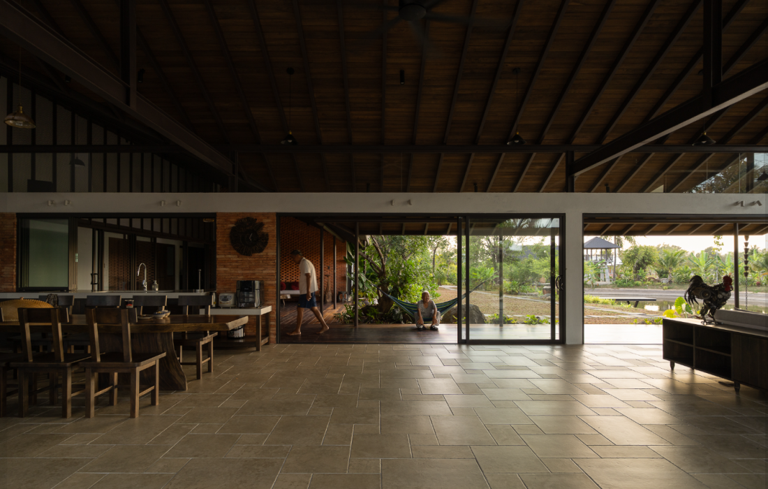 Ngôi nhà được thiết kế theo phong cách mộc mạc nhưng đầy tiện nghi, mang đậm tinh thần của vùng đồng bằng sông Cửu Long. Hãy nhìn lên mái ngói đỏ rộng lớn kia — nó giống như bóng mát của một cây cổ thụ, vừa che chở cho ngôi nhà, vừa hòa quyện hoàn hảo với những tán cây xanh mướt bao quanh.