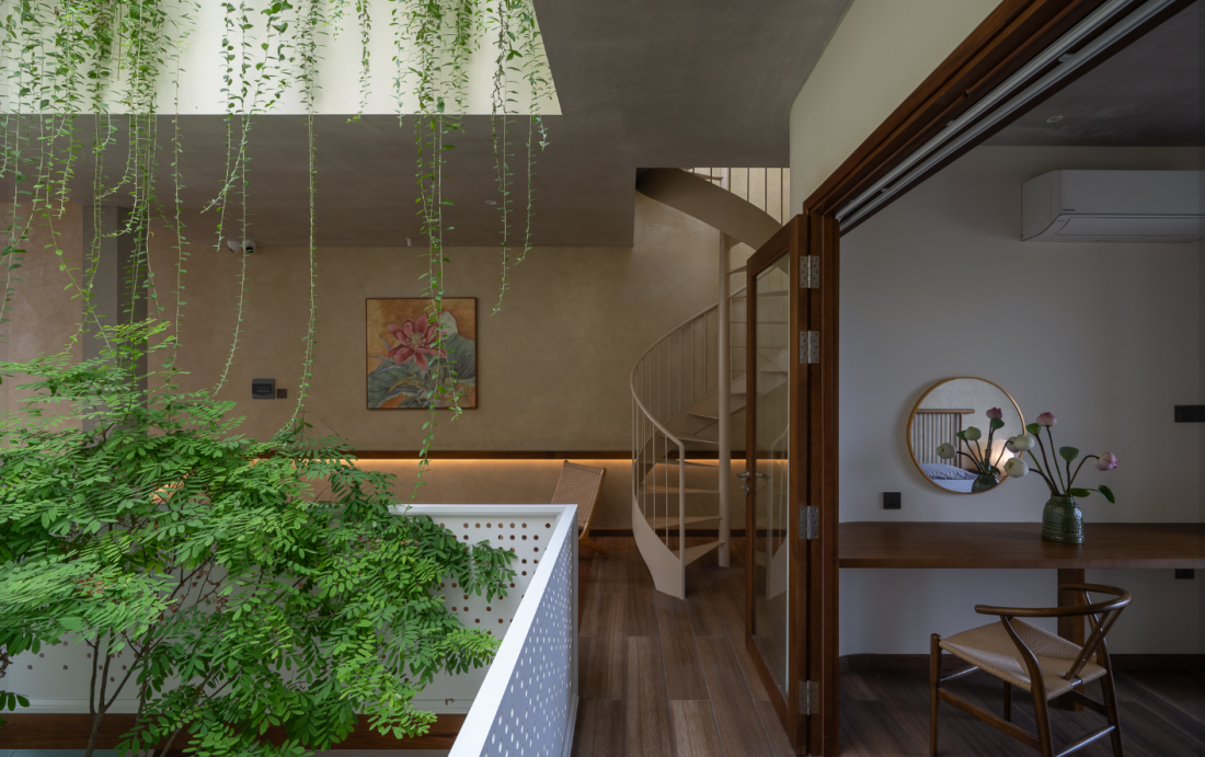 Giếng trời - Trái tim xanh: Trung tâm ngôi nhà là một giếng trời lớn với cây xanh, hoạt động như trái tim xanh của toàn bộ công trình. Ánh sáng ban mai xuyên qua tán cây, đổ bóng xuống sàn nhà, và làn gió mang theo hương lá cây len lỏi vào từng căn phòng. Lõi thông tầng này không chỉ tăng cường thông gió và cách âm mà còn tạo cơ hội cho sự giao tiếp ngẫu nhiên, khi các thành viên có thể nhìn và gọi nhau giữa các tầng.