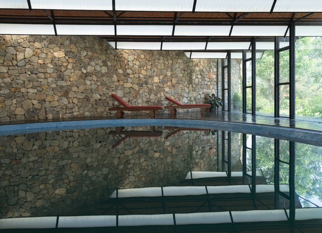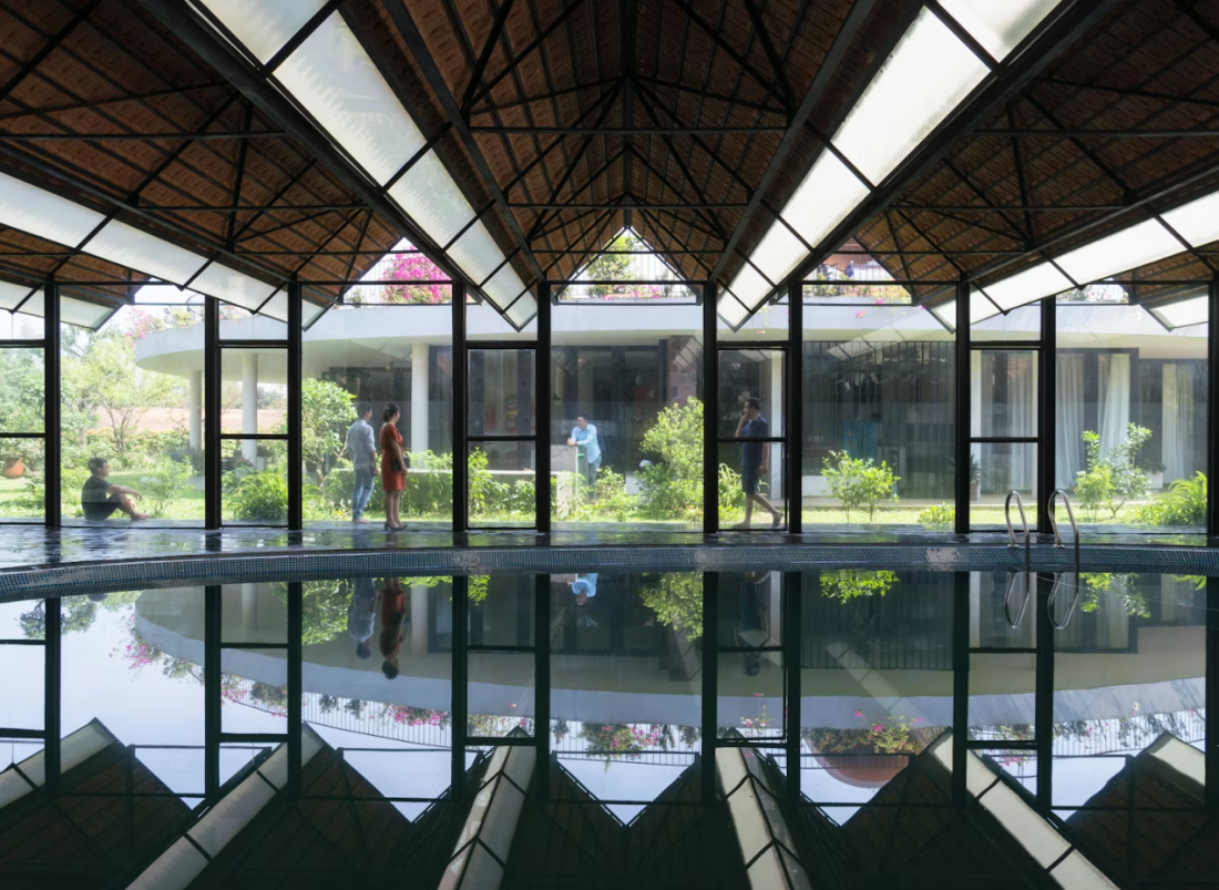 Khối hồ bơi trị liệu (Hình tam giác): Nằm ở phía sau, là nơi thư giãn và trị liệu, đảm bảo sự yên tĩnh tuyệt đối nhờ sự phân tách với khối chính.
