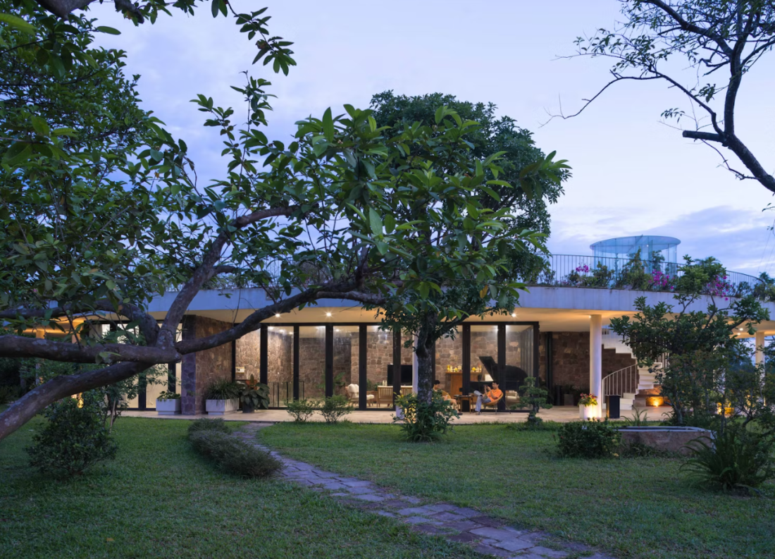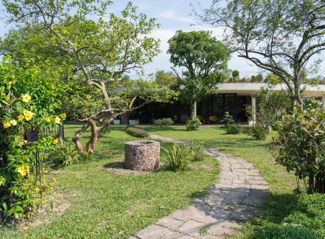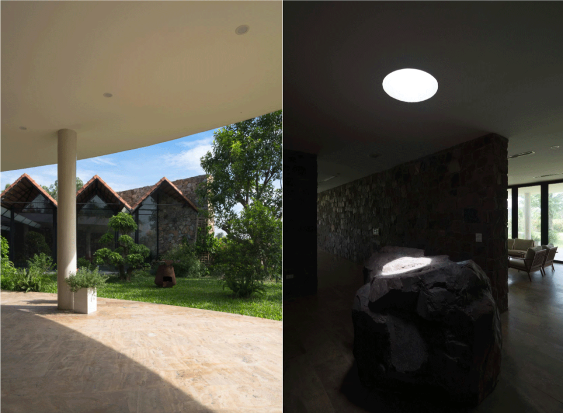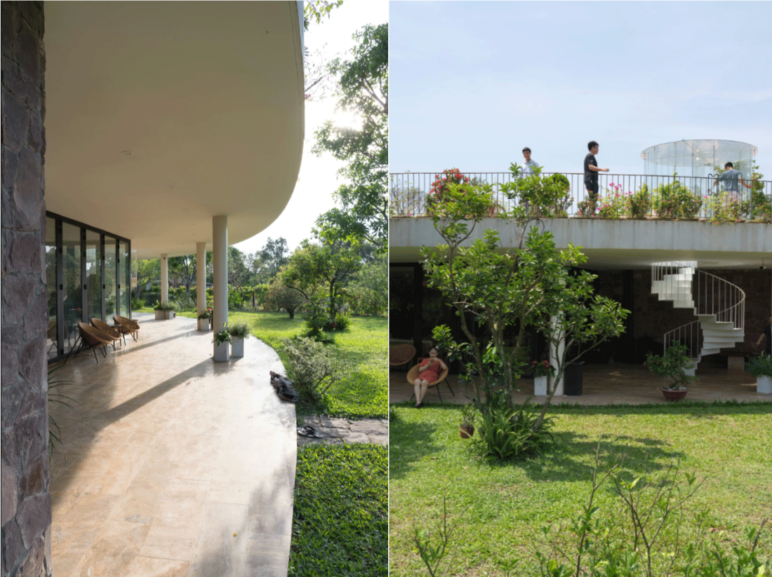 Vòm trời này được nâng đỡ và phân chia thành các không gian riêng tư và công cộng bởi bốn bức tường đá kiên cố, đại diện cho bốn hướng Đông, Tây, Nam, Bắc. Mái hiên truyền thống: Phần mái hiên được thiết kế bao quanh khối elip, mô phỏng mái hiên của nhà cổ Việt Nam. Đây là không gian chuyển tiếp đưa phần nội tâm của con người hòa quyện với thiên nhiên bên ngoài, và cũng là nơi diễn ra mọi hoạt động chính của gia đình.