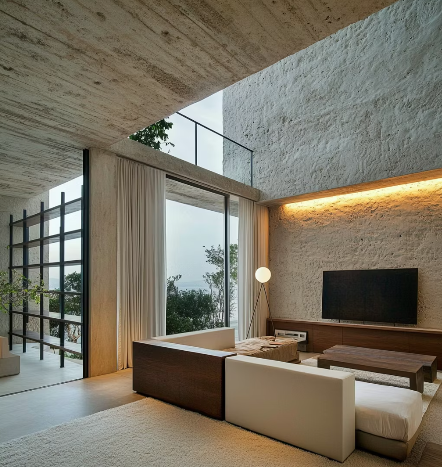 Tuy nhiên, cái lạnh của bê tông ngay lập tức được sưởi ấm bởi sắc nâu trầm của gỗ tự nhiên. Tại phòng khách và khu vực sinh hoạt chung, tầm nhìn được mở rộng hoàn toàn ra những khoảng xanh phía ngoài. Thiết kế này cho phép ánh sáng tự nhiên len lỏi sâu vào từng ngóc ngách, giúp ngôi nhà luôn ngập tràn khí tươi.