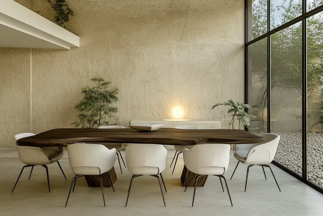 Sự xuất hiện của những thảm sỏi trắng rải rác ở các góc vườn khô tại hành lang, ban công các tầng không chỉ là điểm nhấn thị giác mà còn kích thích thính giác và xúc giác. Vât liệu sỏi và bề mặt bê tông nhám của tường bê tông đối lập với sự mịn màng của gỗ tạo nên một bản giao hưởng vật liệu đầy tinh tế, vừa mộc mạc đơn sơ lại vừa sang trọng. Khu vực ăn uống tại tầng 1 rộng lớn trần cao, bàn ăn gỗ tự nhiên