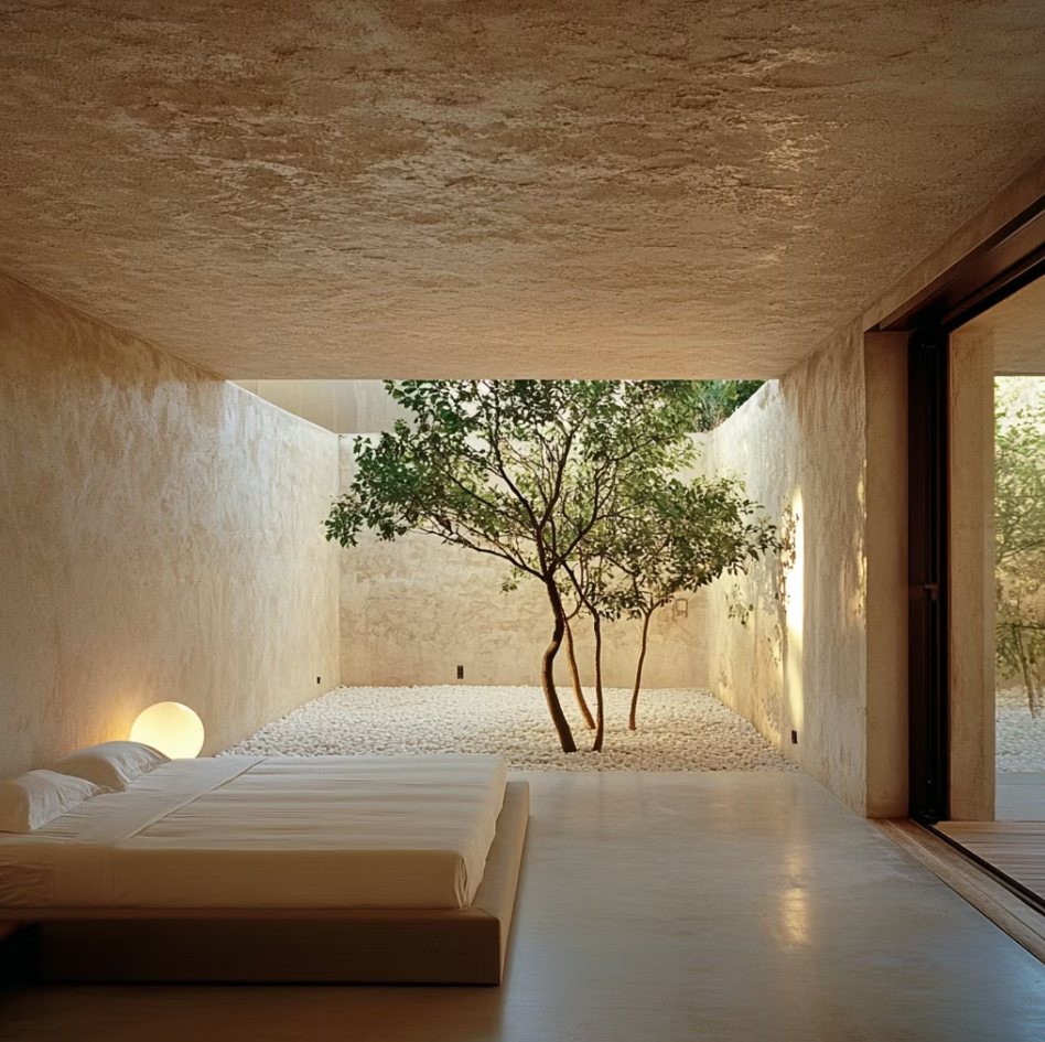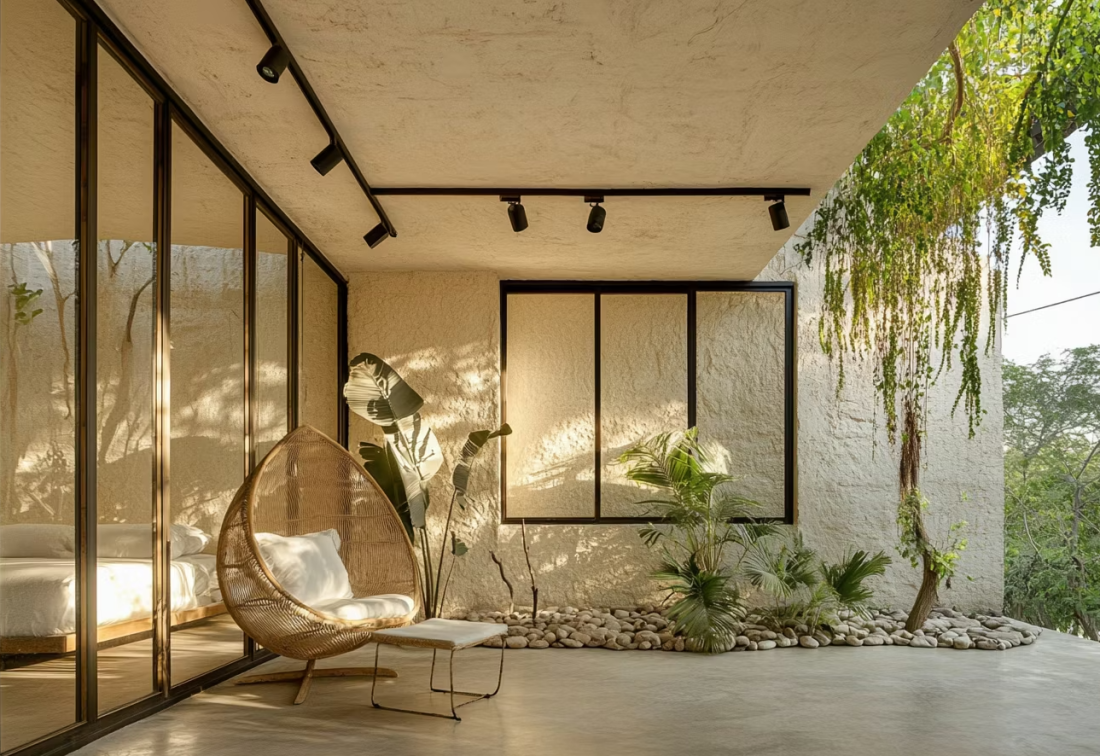 Một đặc điểm chân thật và đắt giá nhất trong ngôi nhà chính là các tiểu cảnh vườn trong. Không cần diện tích quá lớn, chỉ một góc nhỏ với vài tán cây xanh và lớp sỏi trắng mịn cũng đủ để tạo nên một hiệu ứng vi khí hậu tuyệt vời. Đây là nơi triết lý Kiến tạo không gian được thể hiện rõ nét nhất – nơi thiên nhiên không còn là yếu tố trang trí mà trở thành một phần của sự sống. Những góc xanh này đóng vai trò như những lá phổi nhỏ, mang lại sự thanh tĩnh, giúp gia chủ tìm thấy những phút giây tĩnh tâm giữa lòng phố thị.