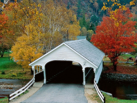 Chiếc cầu nhỏ nhắn này, nhờ có lối thiết kế mái che giản dị, xinh xắn và sắc trắng tinh khôi nổi bật trên nền rừng cây nhiều màu sắc, đã được vinh danh về vẻ đẹp thuần khiết của mình.