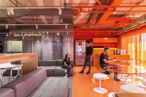 Dự án cho trụ sở mới của Axur Cyber Payment của Arquitetura Nacional cũng tận dụng màu sắc và kết cấu thoải mái và vui nhộn để tạo ra không gian làm việc không gợi nhớ đến văn phòng truyền thống. Một khu vực đơn sắc với sàn, tủ và rèm màu cam được sử dụng cho phòng ăn, nơi nhân viên có thể dùng bữa, trò chuyện vui vẻ và gặp gỡ thân mật.