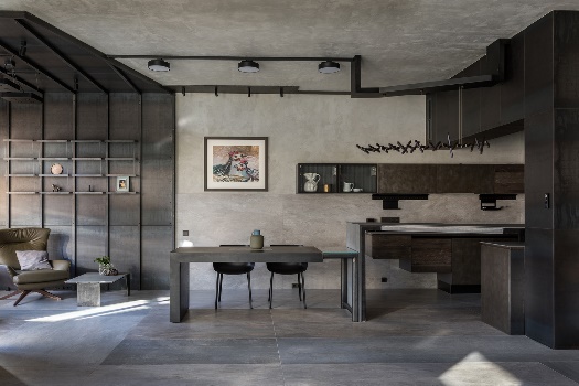 Trong dự án Grey Interiors của Alexey Rozenberg, thiết kế đơn sắc đã được sử dụng để làm nổi bật bộ sưu tập mô hình ba chiều về các nhân vật trong phim của chủ sở hữu. Dự án khám phá các loại vật liệu màu xám khác nhau, chẳng hạn như kết cấu thạch cao, phiến gốm và kim loại đen, để nhấn mạnh bộ sưu tập đầy màu sắc và tươi sáng.