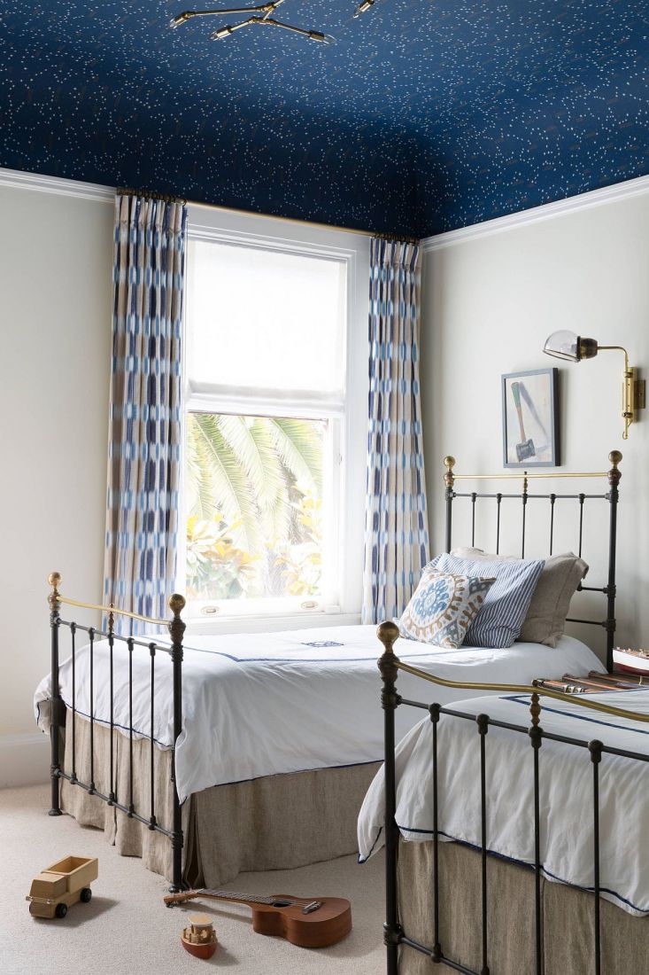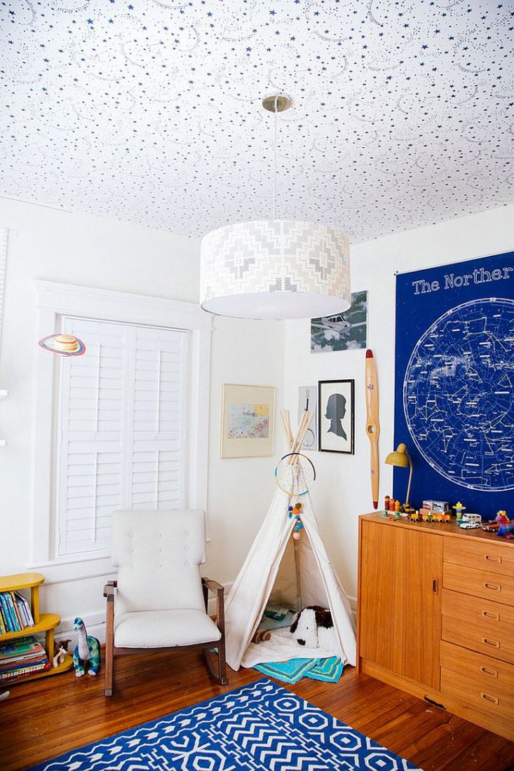 Giấy dán trần mang màu xanh đậm tạo thêm màu sắc tươi sáng cho phòng ngủ của trẻ.