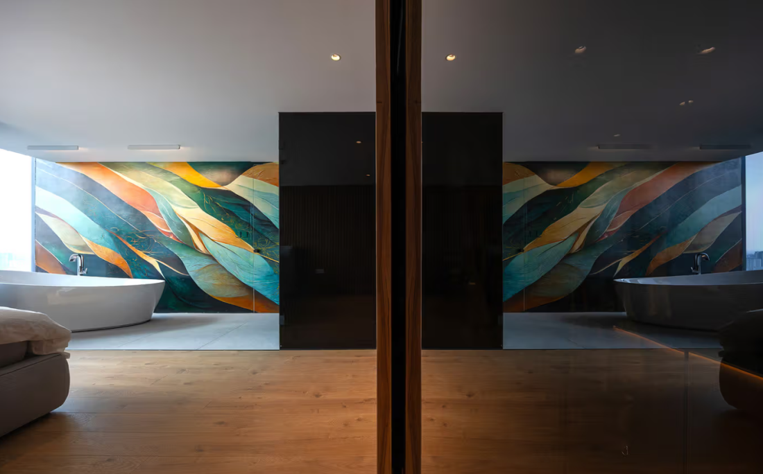Phòng tắm rông rãi nổi bật với tường trang trí, gương lớn.