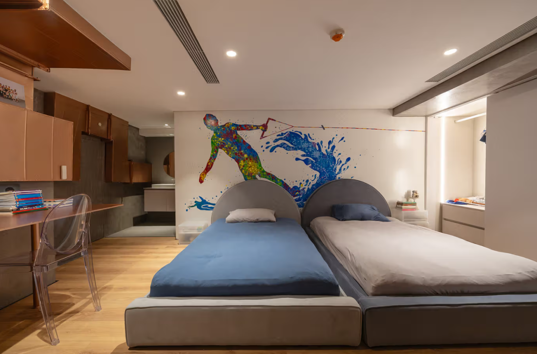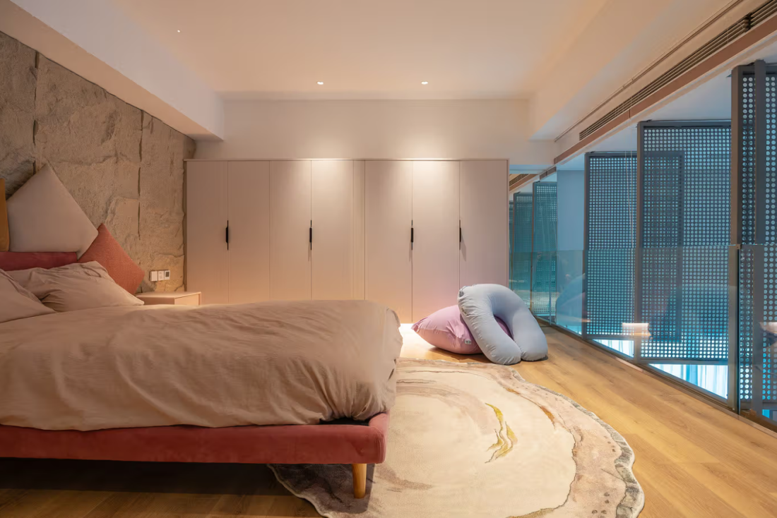 Căn penthouse có 3 phòng ngủ, phòng ngủ Master ẩn sau cánh cửa bí mật tại tầng trệt. Để tăng thêm tính phiêu lưu và bất ngờ, những cánh cửa ẩn đã được bố trí một cách chiến lược. Chúng không chỉ kết nối các khu vực một cách liền mạch mà còn có thể đóng lại khi cần sự riêng tư. Điều này mang lại sự linh hoạt và tính đa năng, phản ánh tinh thần sáng tạo và tự do của gia chủ.