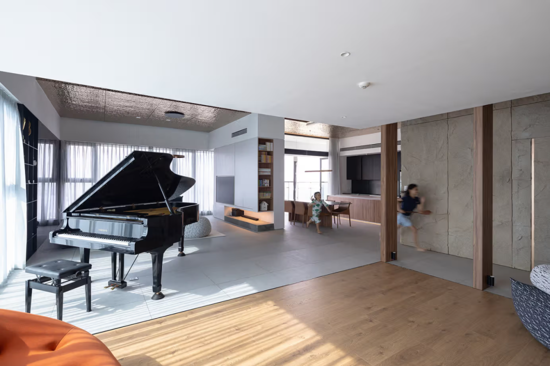 Không gian chung rộng lớn: Không gian chung của căn hộ giờ đây được giải phóng hoàn toàn, mở ra tầm nhìn bao quát ra bên ngoài. Các chức năng phụ trợ như phòng tắm, nhà vệ sinh hay tủ đồ được bố trí ẩn trong các hốc tường và vách đá, giúp không gian chính luôn rộng rãi và thoáng đãng.
