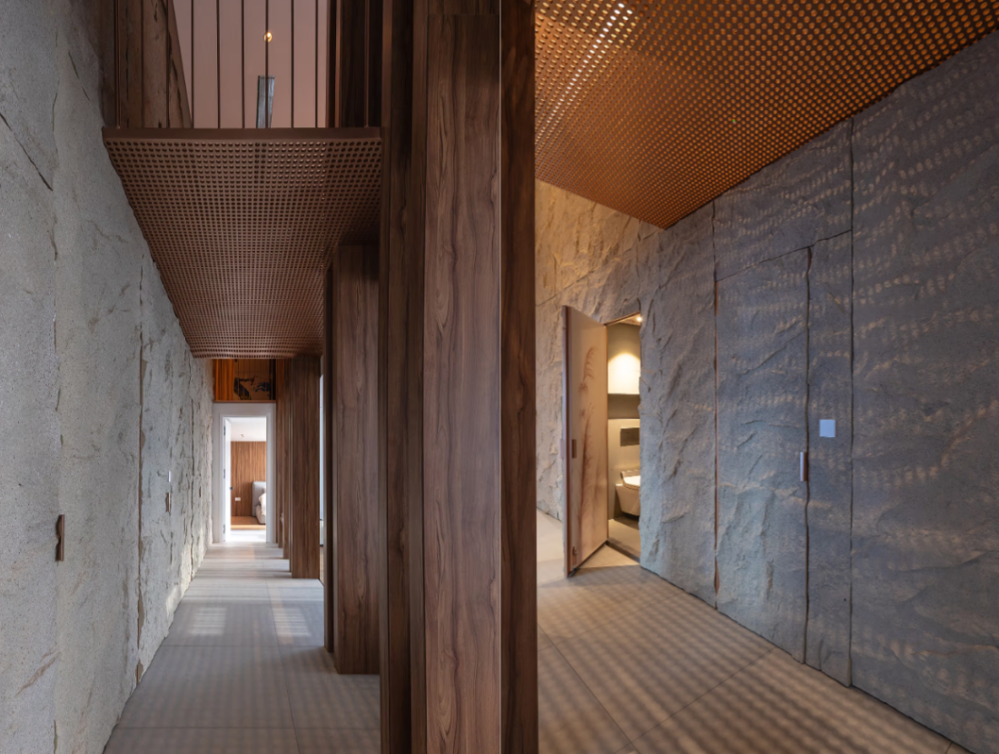 Vách đá bí ẩn: Điều đặc biệt nhất chính là bức tường đá lớn, nơi ẩn chứa mọi chức năng phụ trợ. Nhà vệ sinh, phòng tắm, và các khu vực lưu trữ đều được giấu kín một cách khéo léo bên trong bức tường này. Sự tương phản giữa vật liệu đá thô ráp và những yếu tố hiện đại tạo nên một không gian gợi nhớ đến một hang động hoặc khu rừng bí ẩn, đầy kích thích và tò mò.
