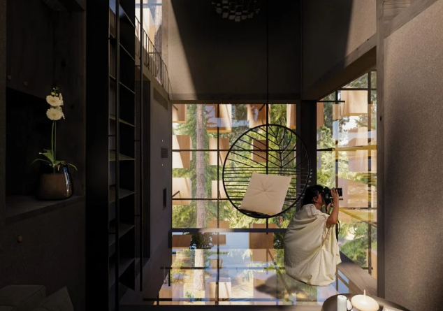 Cửa sổ kính 3 lớp, có chiều cao từ trần đến sàn, cũng như trần và sàn bằng kính, sẽ mang đến cho du khách nhiều điểm ngắm chim và sân thượng cũng có tầm nhìn ra toàn cảnh khu rừng.