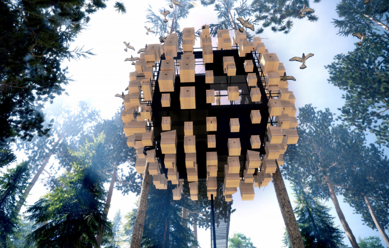 350 chuồng chim với nhiều kích cỡ khác nhau sẽ nhô ra khỏi cấu trúc hình khối và tạo thành một đám mây hình cầu bao quanh căn phòng.