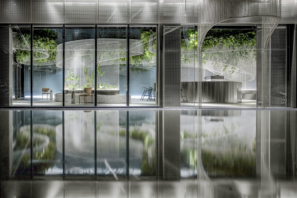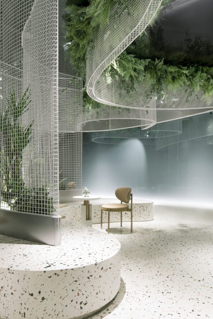 Một quán cafe ngoài sức tưởng tượng bằng cách tạo ra trần nhà với các đường lưới kim loại màu trắng uốn lượn, bên ngoài dùng cửa kính phản chiếu tạo cảm giác hư, thực. Với cấu trúc này mang lại sự thanh lịch, mượt mà cho không gian nhưng không kém sự hấp dẫn, ấn tượng.