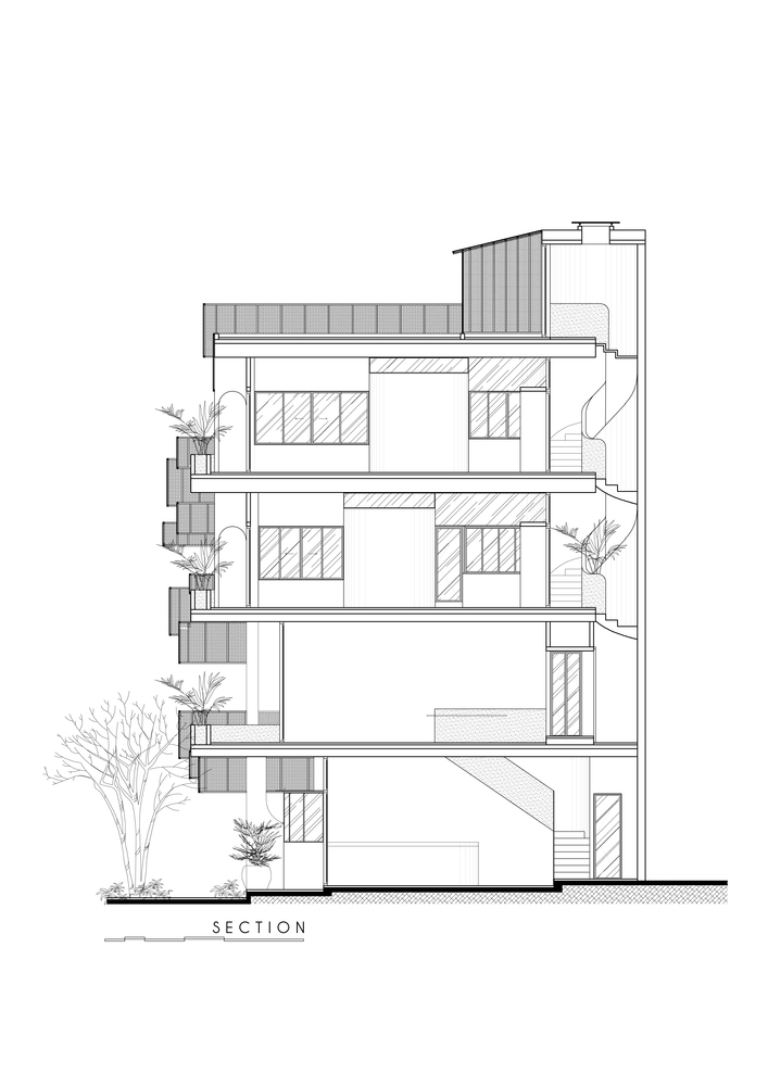 Thay vì tổ chức một lõi giếng trời kết nối thiên nhiên ở giữa nhà như nhiều mô hình nhà ống thường gặp, kiến trúc sư lấy không gian sống chủ đạo làm cốt lõi, lớp thiên nhiên sẽ bao bọc xung quanh, thể hiện bằng cách tương tác trực tiếp hoặc thông qua các hành lang cây xanh hẹp chạy dọc các không gian chức năng ở, được sắp đặt phù hợp với góc chiếu ánh sáng mặt trời và hướng gió của địa phương.