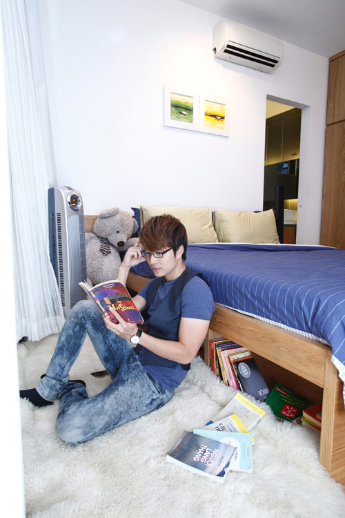 Thanh Tú rất mê sách. Vì thế, anh chàng dành một không gian đọc sách ngay trong phòng ngủ. Gầm giường được tận dụng làm kệ sách nhỏ để cất những cuốn thường đọc nhất. Thanh Tú thích được ngồi duỗi chân dưới tấm thảm êm ái, vừa nhâm nhi li cà-phê, vừa lần giở từng trang sách.