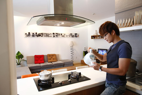 Để tạo cảm giác rộng và thoáng cho ngôi nhà, Thanh Tú đã bỏ bớt một số bức tường ngăn cách giữa các phòng. Bếp và khu vực tiếp khách được ngăn cách bằng chiếc bàn ăn kiểu Tây thiết kế liền kề như một quầy bar nhỏ. Những chiếc ghế ăn màu sắc sinh động ôm lấy bàn ăn giúp cho phòng bếp không đơn điệu. Bức tường kính ngăn phòng ngủ với phòng khách nên có cảm giác đây là một không gian mở, rộng và thoáng.