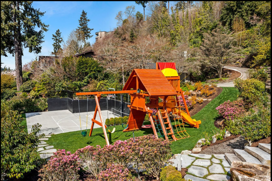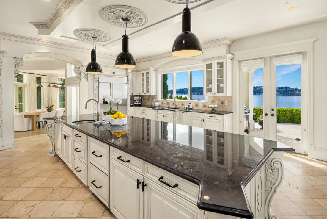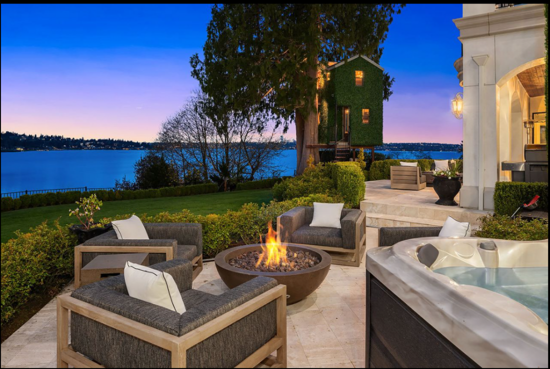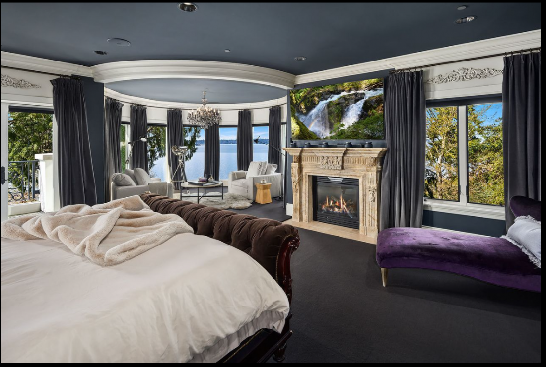 Nằm trong cộng đồng dành cho giới thượng lưu tại Bellevue, Washington, dinh thự 6 phòng ngủ, 7 phòng tắm nằm trên một bãi đất trống phía trên hồ Washington và có khoảng 82m mặt tiền.