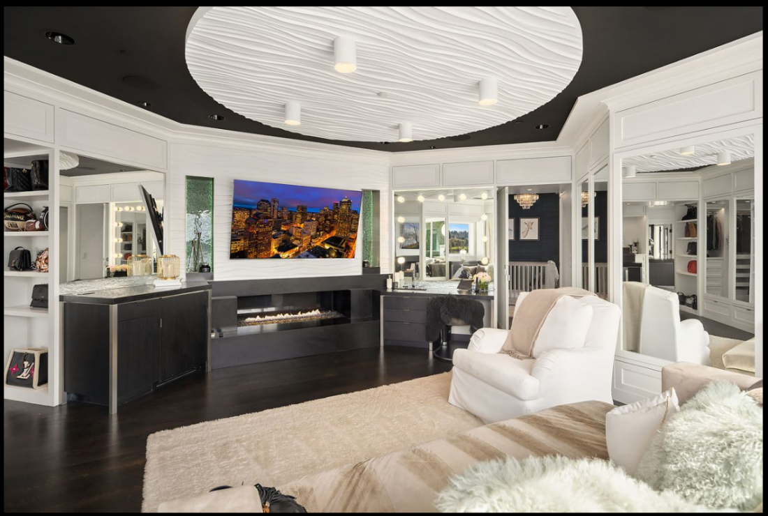 Một trong những tiện nghi độc đáo là tủ quần áo rất tinh tế và có tất cả mọi thứ. Khi bước ra khỏi phòng tủ quần áo, bạn có thể trải nghiệm phòng thẩm mỹ viện hay phòng trang điểm với lò sưởi, khu vực tiếp khách được bao quanh bởi những bức tường trong suốt để bạn nhìn ra quang cảnh Hồ Washington tuyệt đẹp.