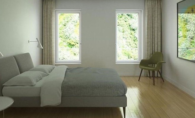 Phòng ngủ với hai cửa sổ lớn nhìn ra khung cảnh thiên nhiên tuyệt đẹp.