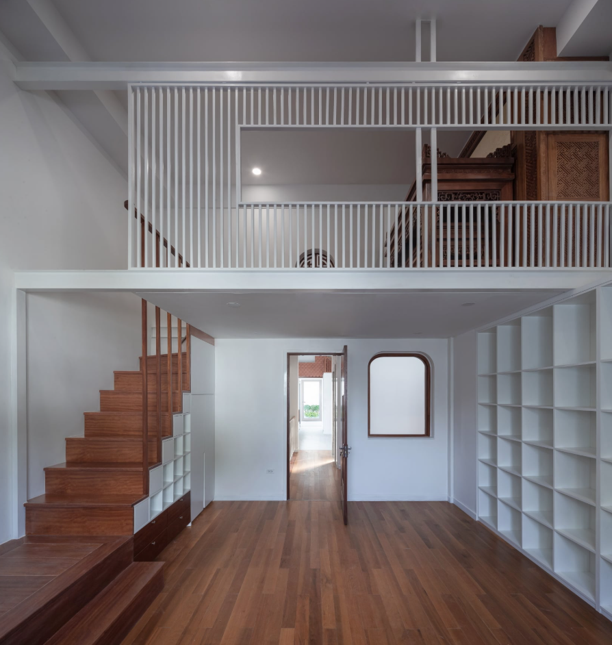 Lên đến tầng 5, sự thú vị về mặt khối tích mới thực sự bùng nổ. Tại đây, một gác lửng được thêm vào để làm phòng Thờ, trong khi phía dưới là Studio sáng tạo.