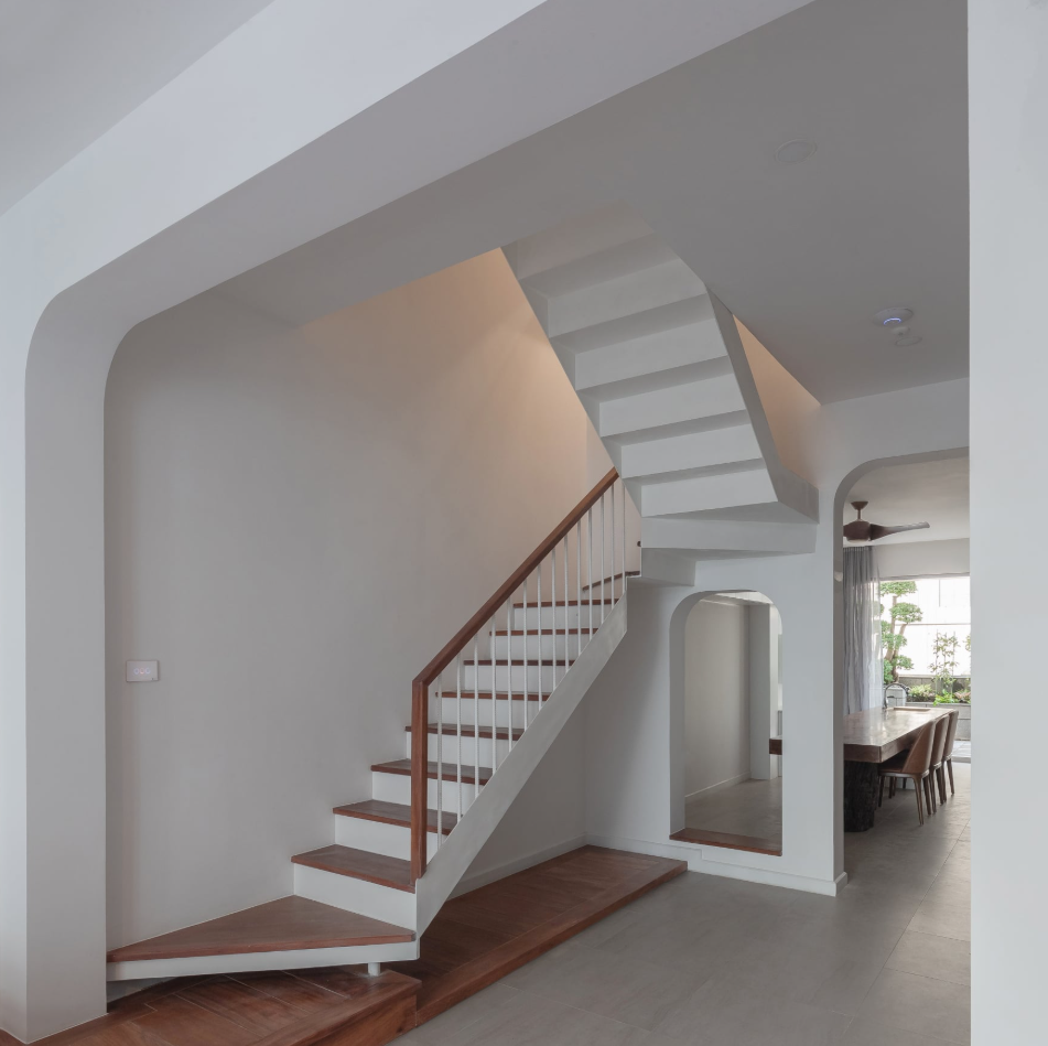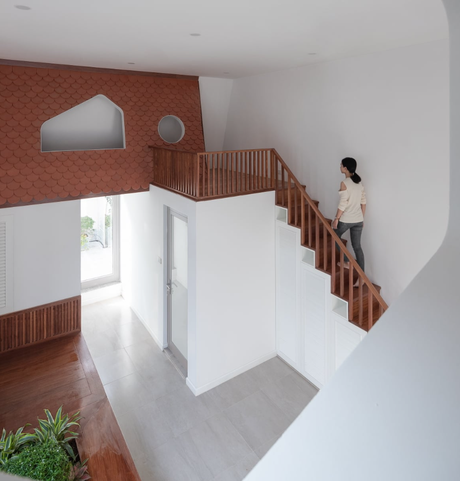 Cầu thang nép mình bên hông nhà và bố trí ngay khoảng thông tầng giúp điều hòa không khí và ánh sáng.