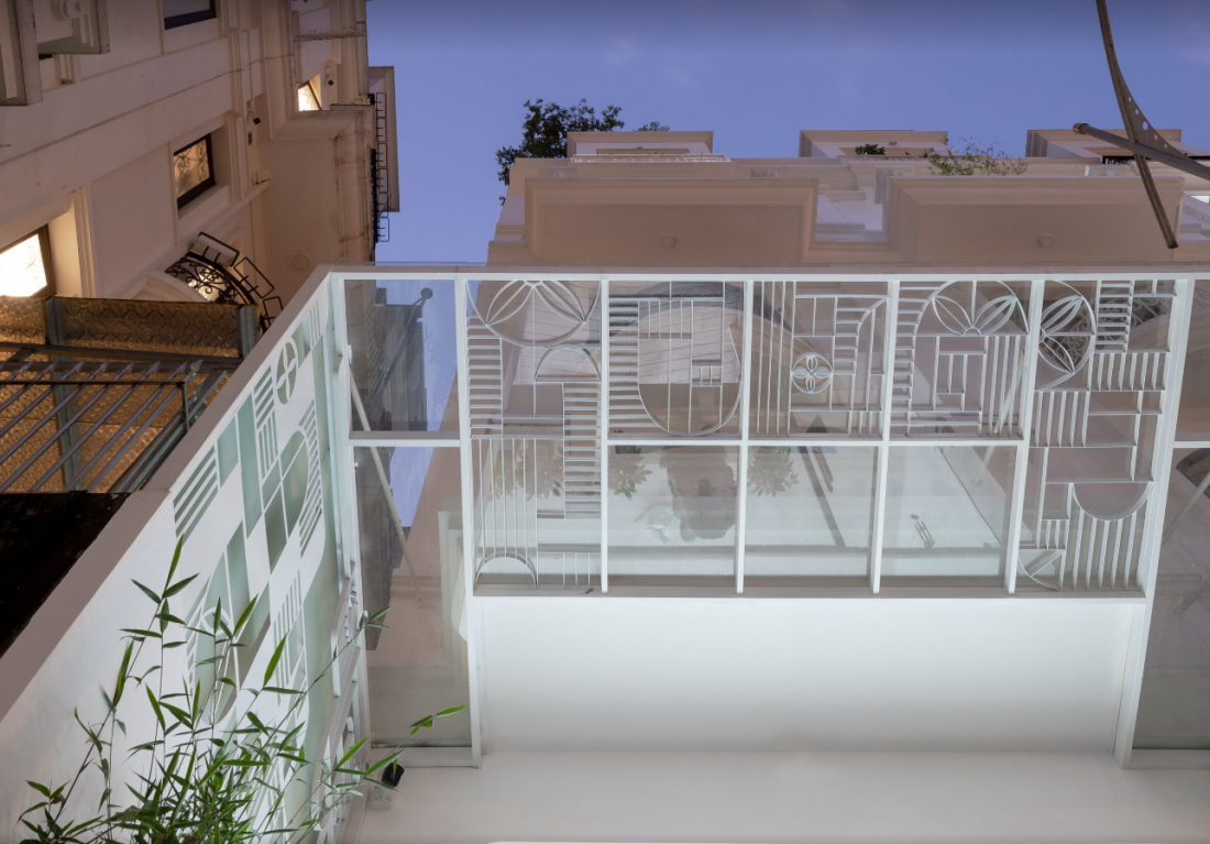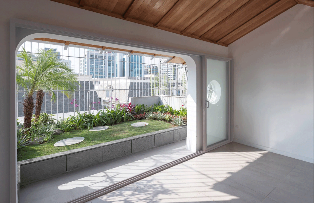 Nếu các tầng dưới là sự đan cài của các chức năng, thì tầng 5 là nơi cảm xúc được thăng hoa. Tại đây, một phòng khách thứ hai được thiết kế như một vọng lâu giữa trời, bao quanh bởi hai khu vườn trước và sau.