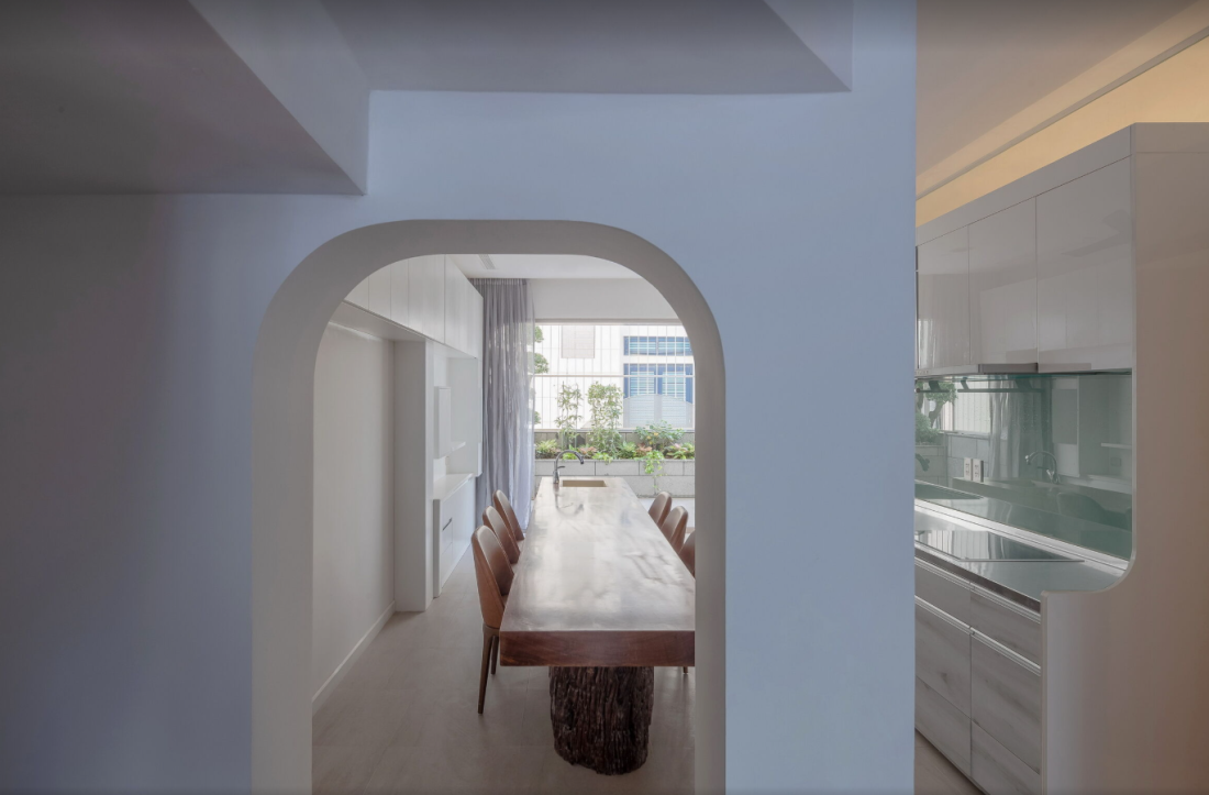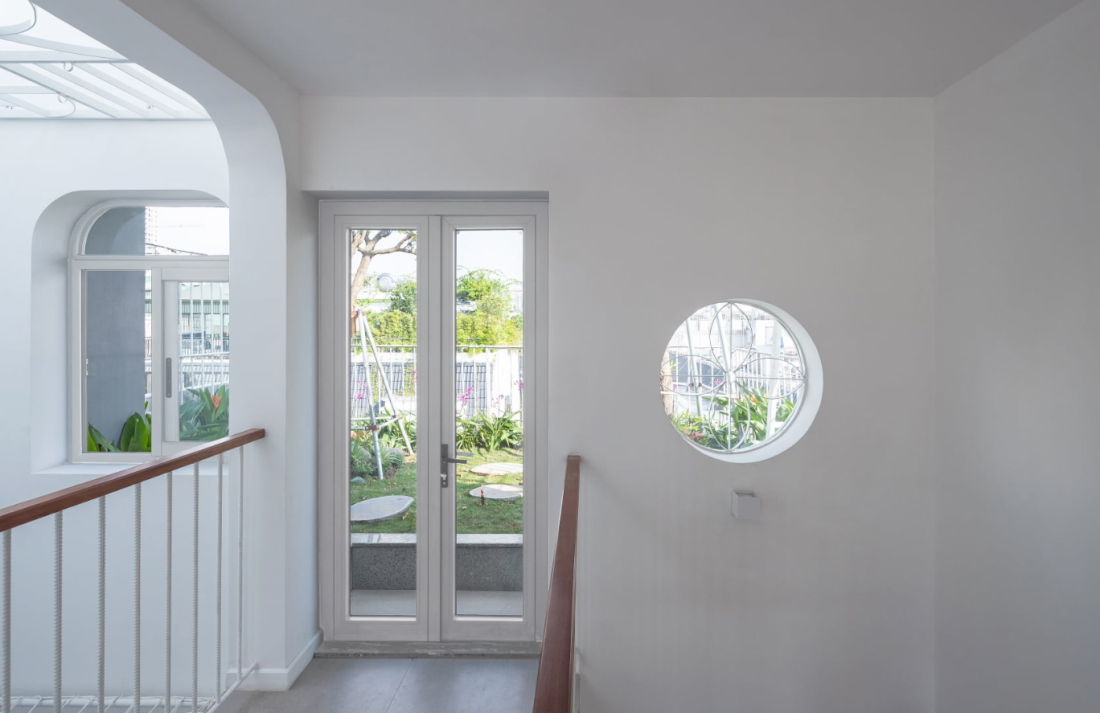 Nằm giữa khu vực ngoại ô Nha Trang với những nếp nhà tự phát, hệ thống hạ tầng chằng chịt và tiếng ồn đô thị đặc trưng, ngôi nhà hiện lên như một khối trắng bo cong tiết chế.