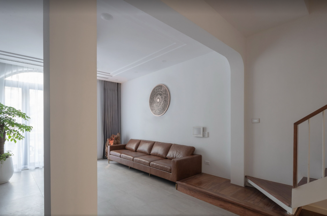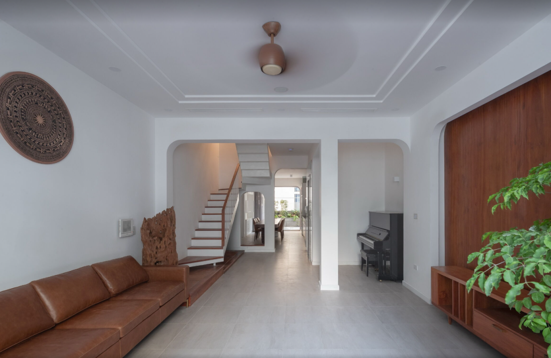 Sử dụng hệ thống cửa kính lớn, phòng khách này dường như tan biến ranh giới với thiên nhiên. Gia chủ có thể tận hưởng cảm giác nhâm nhi tách trà giữa khu vườn thượng uyển, nơi gió trời và ánh sáng tự nhiên luôn tràn ngập. Đây chính là giải pháp làm mềm kiến trúc nhà ống, biến nó từ một chiếc hộp kín thành một thực thể xốp và biết thở.