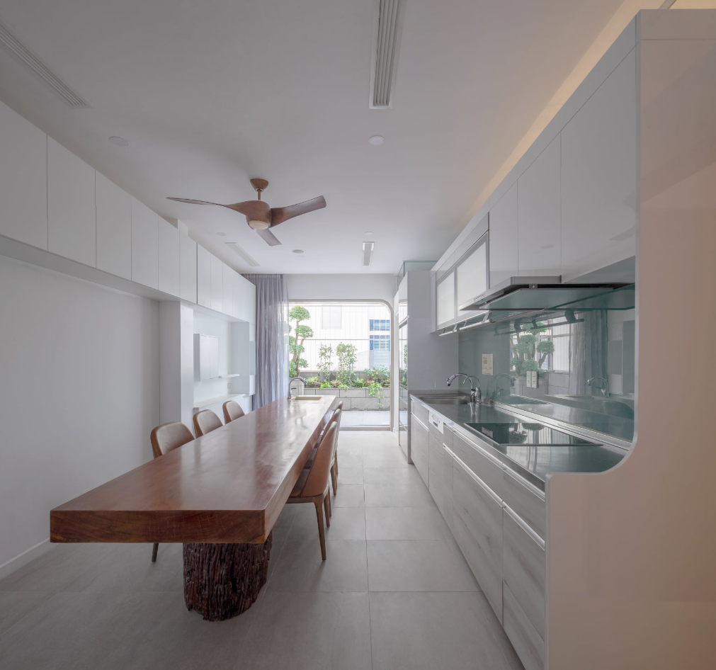 Ngôi nhà dài và ngang hẹp nên thay đảo bếp bằng bàn ăn gỗ kết hợp bếp nấu chữ I âm tường