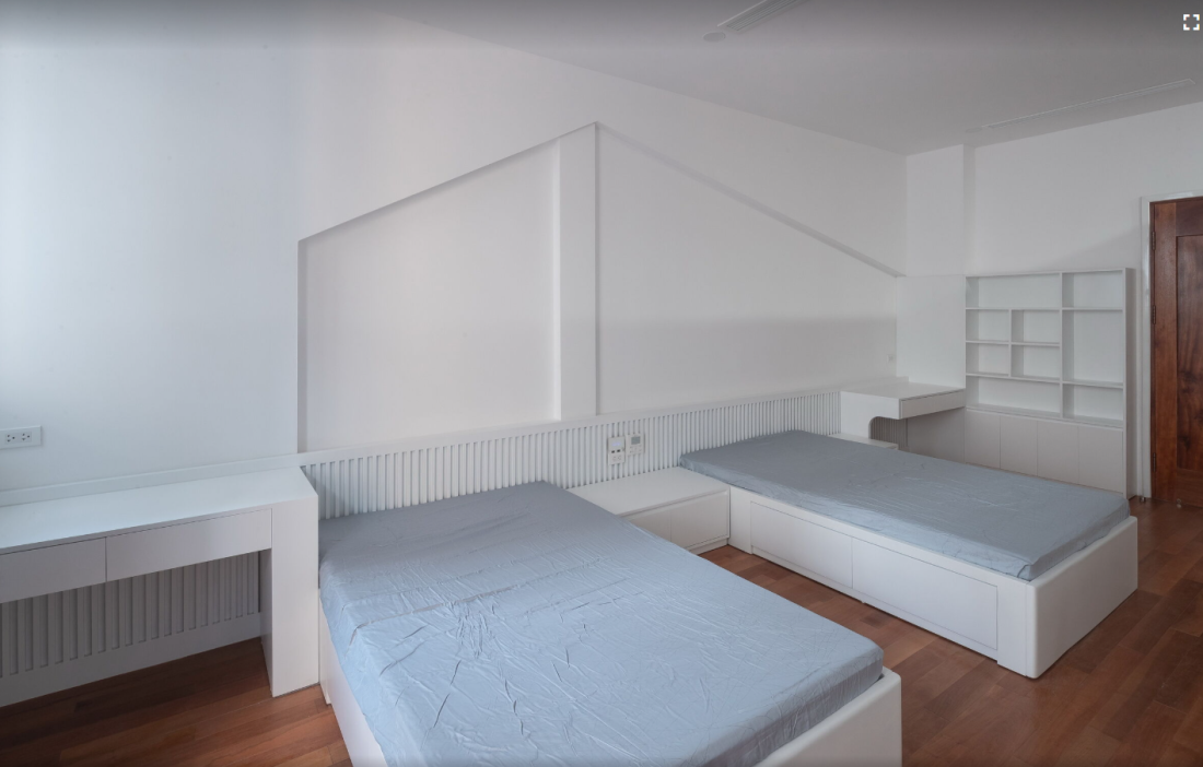 Tầng 3 và 4 là không gian riêng tư tương ứng 4 phòng ngủ. Trong đó phòng ngủ của con bố trí 2 giường đơn