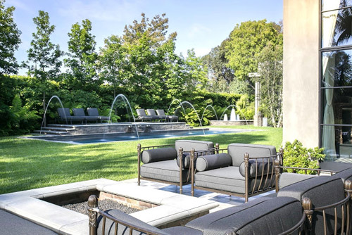 Sân sau có nhiều không gian ngồi nghỉ ngơi, vị trí này bố trí lò sưởi ngoài trời và một bể bơi tuyệt đẹp.