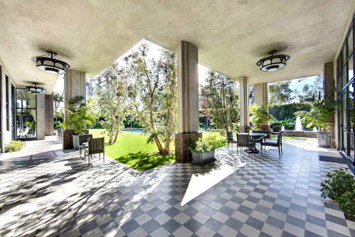 Hiên nhà lát gạch đá tông màu xám – trắng cùng view đẹp hướng về phía bể bơi.