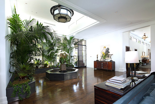 Tiền sảnh bố trí không gian trồng cây, các loại thực vật và đài phun nước.