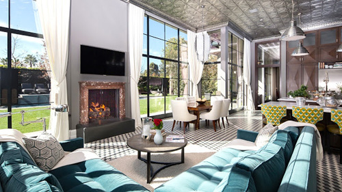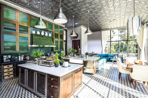 Căn bếp chuyên nghiệp khổng lồ có trần nhà được ốp thiếc, sàn nhà lát gạch men họa tiết hình học, đèn trần phong cách công nghiệp. Bàn ăn sáng và khu vực ngồi được bao quanh bởi những khung cửa sổ kính cao tận trần nhà.
