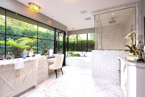 Phòng tắm chính làm bằng đá cẩm thạch, các viền cửa sổ được bọc thép.