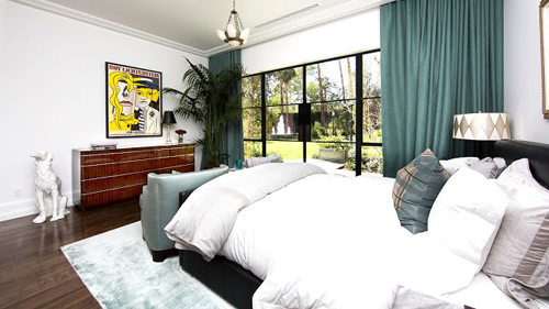 Phòng ngủ có sàn nhà ốp gỗ, rèm cửa màu xanh ngọc nhẹ nhàng, nổi bật nhất là chiếc giường bọc da màu đen.