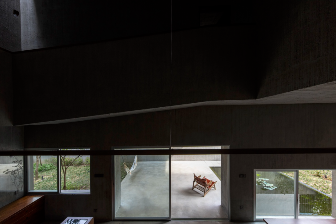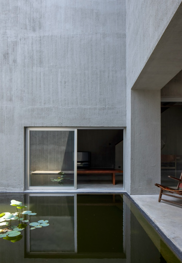 Ngôi nhà tạo nên một không gian yên tĩnh giữa khu vườn, cây cối, mặt nước và ánh sáng được thay đổi theo thời gian từ tối đến sáng tạo nên một không gian sống độc đáo.