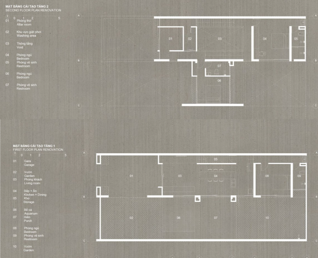 Bản vẽ mặt bằng cải tạo nhà phố tối tăm thành không gian kiến trúc tối giản thoáng sáng bất ngờ bằng cách sử dụng bê tông trần tại Đà Nẵng.