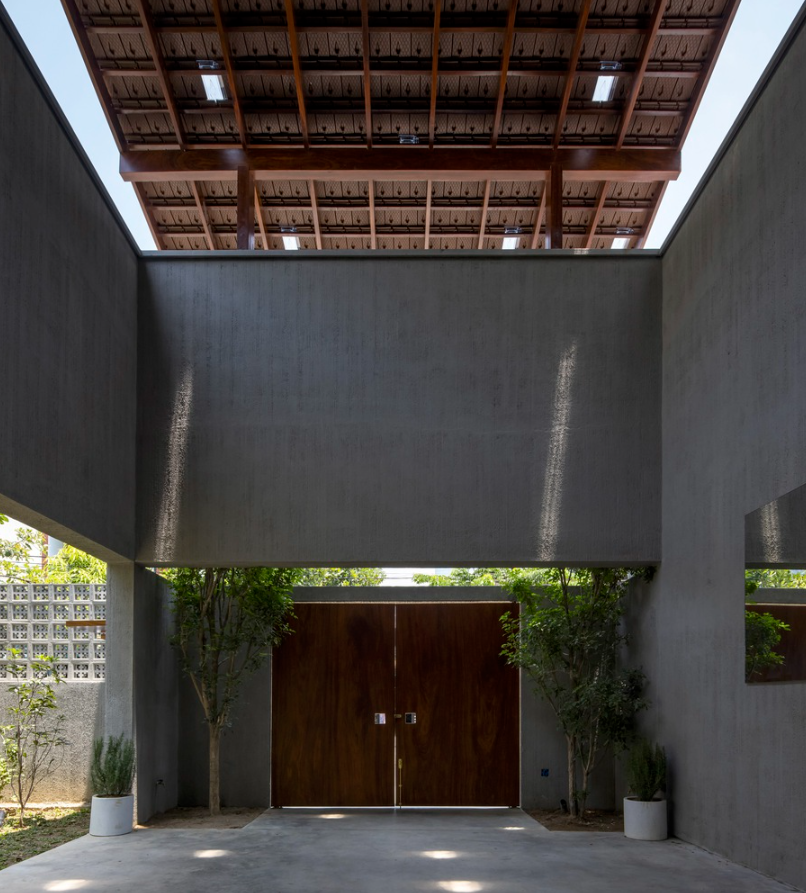 Hiên trước nhà cũng là gara để xe với kết cấu trần bê tông trần cao xen kẽ là khoảng hở giữa khu vực mái.