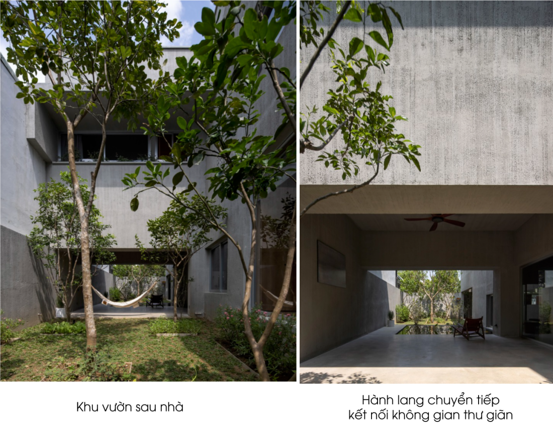 Thứ 2, thay đổi chức năng hiện trạng cũ thành các không gian chức năng hướng về khu vườn phía Nam bằng cách sử dụng hệ thống khung có kết cấu bê tông hình chữ T gần như đối xứng với khu vực ăn uống ở trung tâm. Với cách này giúp ngôi nhà mát mẻ trong suốt hè kết hợp tận dụng ánh sáng mặt trời phía Đông và Đông Nam.